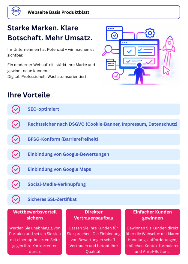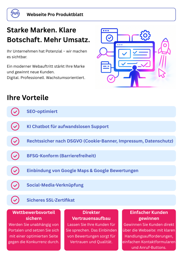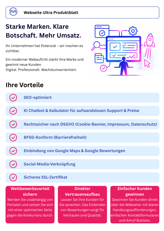 Ein Baukasten liefert Ihnen nur eine einfache Standardseite. Wir hingegen entwickeln ein durchdachtes System zur Kundengewinnung – mit Strategie, SEO-Optimierung, individuellen Texten, Design und optionalen Tools wie einem Angebots-Konfigurator oder Chatbot. So entsteht eine Website, die wirklich Ergebnisse liefert.